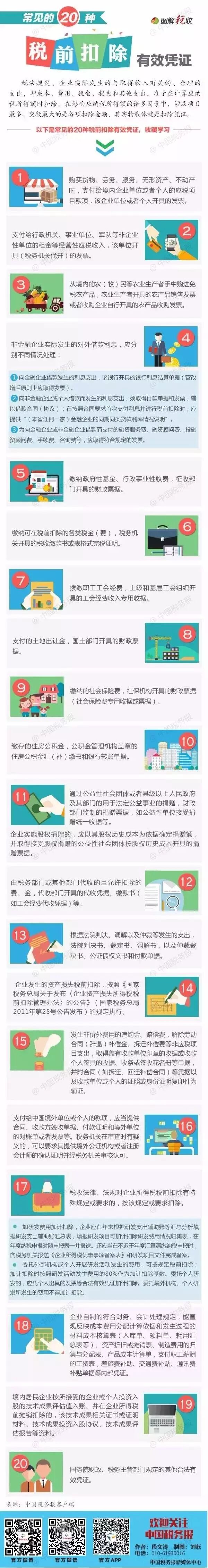 税法规定,企业实际发生的与取得收入有关的、合理的支出,即成本、费用、税金、损失和其他支出,准予在计算应纳税所得额时扣除。在影响应纳税所得额的诸多因素中,涉及项目最多、变数最大的是各项扣除金额,其实物载体就是扣除凭证。以下是常见的20种税前扣除有效凭证,收藏学习哦!